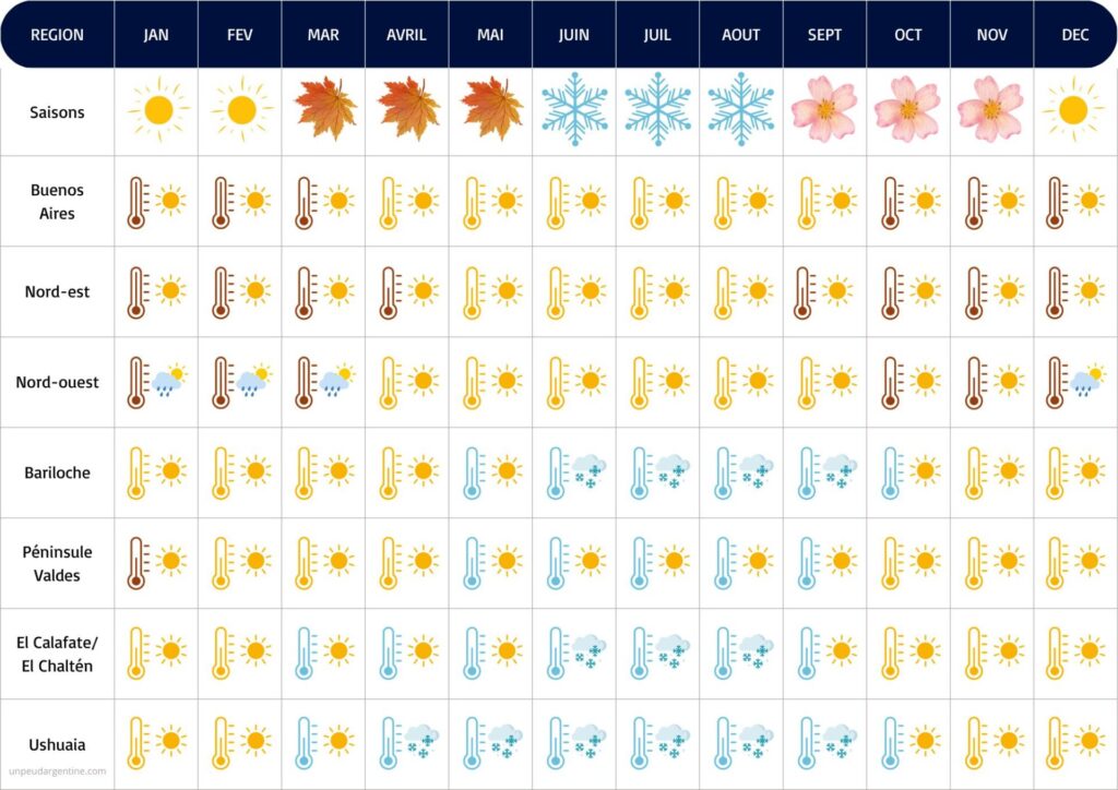 Voici un récapitulatif des meilleures périodes pour partir en Argentine. L’hiver, vous pouvez aller dans le sud (El Calafate, El Chaltén, Ushuaia) mais les sentiers de randonnée peuvent être fermés à cause de la neige.